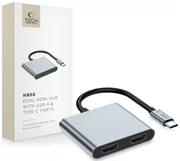 Tech-Protect HB08 este un accesoriu compact și versatil care extinde semnificativ capacitățile dispozitivelor echipate cu un port USB-C. Adaptorul oferă două ieșiri HDMI pentru conectarea simultană a până la două monitoare, un conector USB-A 2.0 pentru transferul de date și un port USB-C cu Power Delivery de până la 100 W doar pentru încărcare.