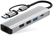 Adaptorul are două porturi USB-A 2.0, care permit viteze de transfer de date de până la 480 Mbps pentru transferuri eficiente de fișiere între dispozitive. Un port USB-A 3.0 oferă o viteză de transfer și mai mare, de 5 Gbps, care este deosebit de utilă pentru transferul de fișiere mari, cum ar fi fișiere video sau grafice. Adaptorul are, de asemenea, un port USB-C pentru transferul de date și un port RJ45 pentru a conecta dispozitivul la o rețea Ethernet.