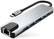 Adaptorul are un port USB-A 2.0 pentru viteze de transfer de date de până la 480 Mbps și un port USB-A 3.0 pentru viteze de transfer mai mari de 5 Gbps, care este deosebit de util pentru transferul de fișiere mari, cum ar fi video sau grafică. Dispozitivul este echipat cu două porturi USB-C cu funcții diferite: un port USB-C PD (Power Delivery) de 100 W doar pentru încărcare și un al doilea port USB-C pentru transfer de date. În plus, adaptorul acceptă standardul HDMI 4K/30Hz, permițându-vă să conectați un afișaj de înaltă calitate. De asemenea, datorită portului RJ45, vă puteți conecta cu ușurință dispozitivul la o rețea Ethernet.